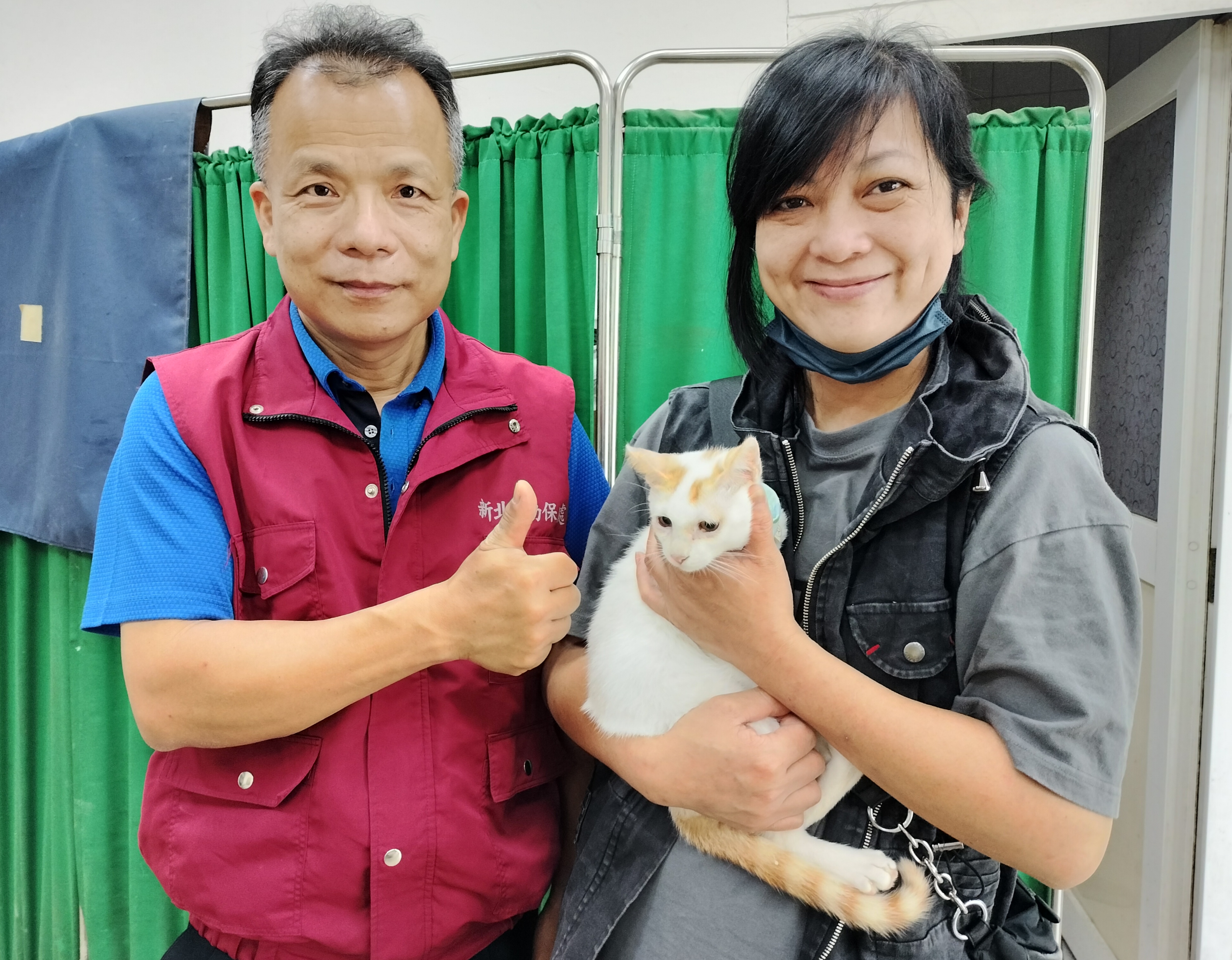 新北市動保處日前接獲民眾通報石門區淡金公路有1隻橘白色幼貓,奄奄一息躺在路旁報廢冷氣機內,隨即派員前往將受傷幼貓帶回三芝動物之家進行檢傷醫療,經獸醫師謝弘斌仔細檢查後,發現小幼貓因長期未進食導致身體嚴重脫水、眼球及鼻腔細菌感染造成發炎,經動保處毛寶貝醫療中心獸醫師會診,隨即進行眼科手術並給予必要醫療照護,恢復健康之後送至石門區尖鹿里辦公處設立之認養小棧,交由里長邱朝欉協助送養,民眾黃小姐一眼看到小橘貓就非常喜歡,抱起牠來覺得很有緣份,隨即辦理認養手續給牠一個永遠幸福的家。